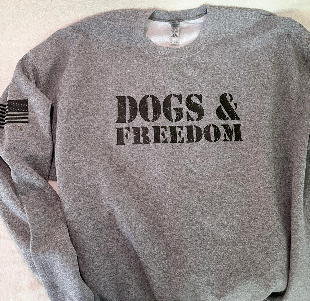 Home › Shop › Sweatshirts › Heather Gray Dogs & Freedom Crewneck